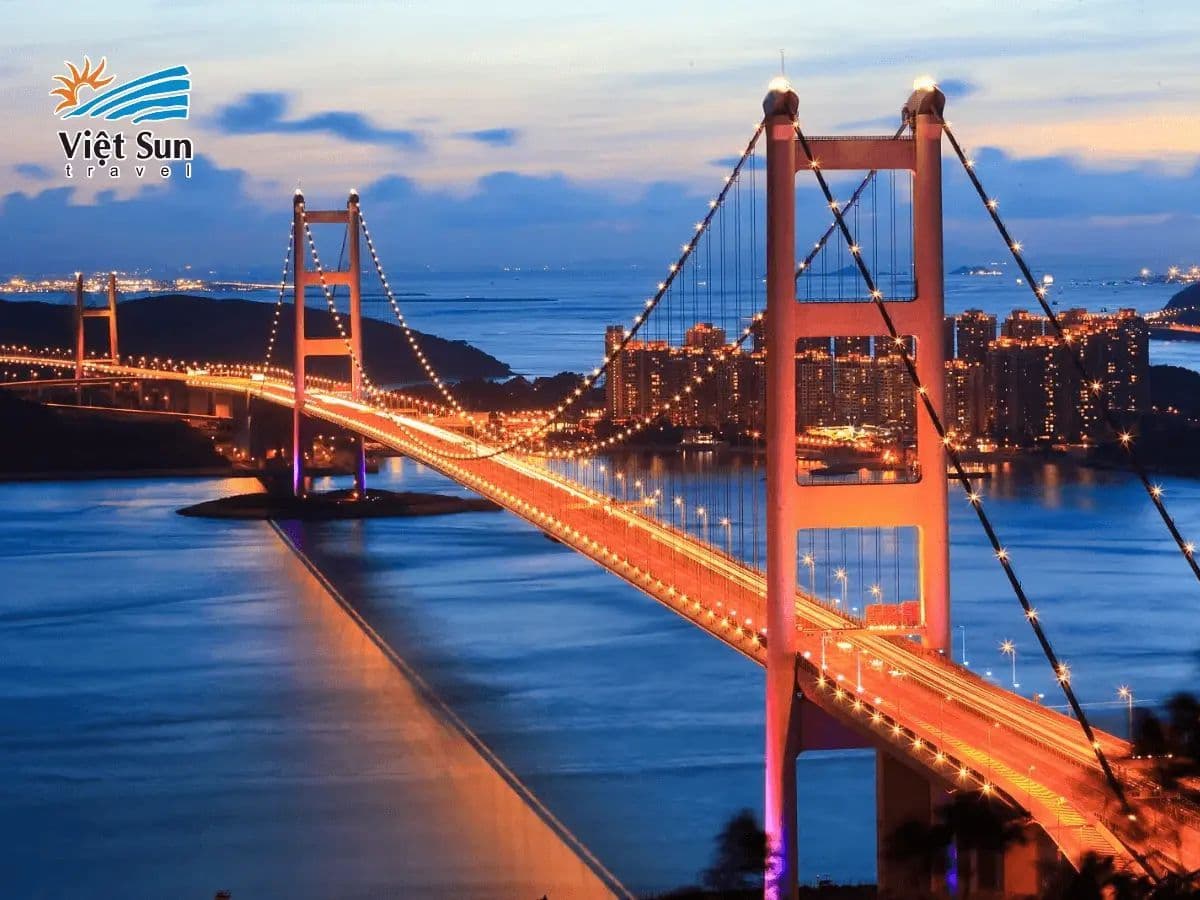 Xe và hướng dẫn viên đón đoàn tại sân bay Chek Lap Kok và đưa Quý khách di chuyển về bán đảo Cửu Long. Quý khách đi qua Cầu Thanh Mã một trong những cây cầu đẹp nhất châu Á và có nhịp cầu lớn thứ 7 thế giới.