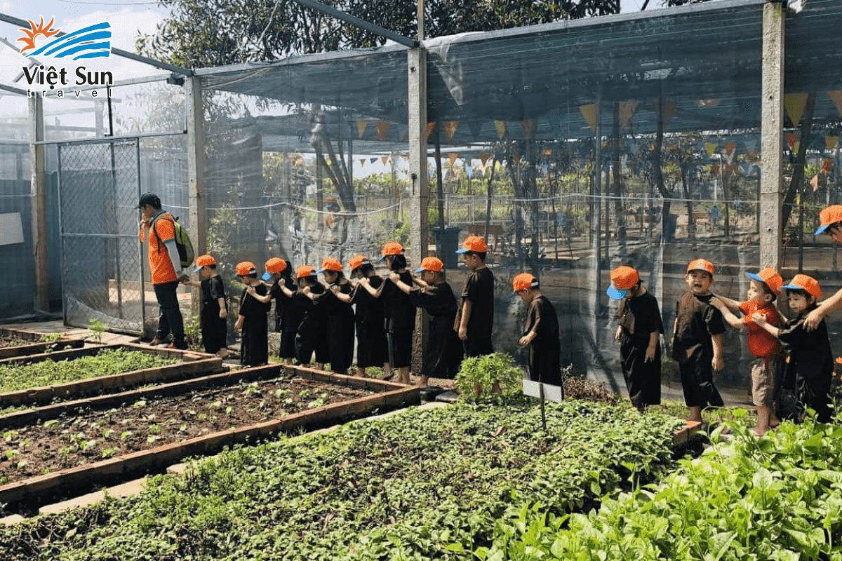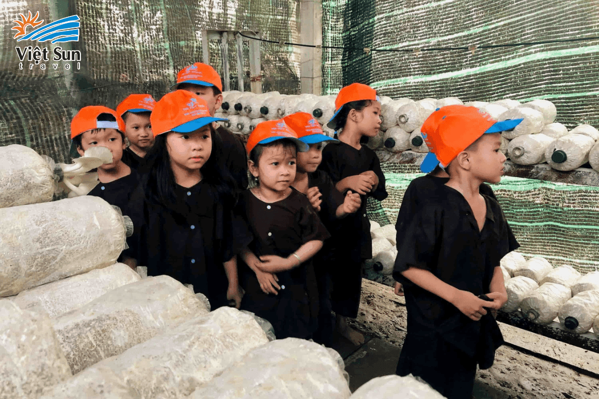 Tham quan vườn rau hữu cơ & nhà nấm bào ngư: Các em được hướng dẫn cách trồng rau sạch và chăm sóc nấm bào ngư – một loại thực phẩm giàu dinh dưỡng.
